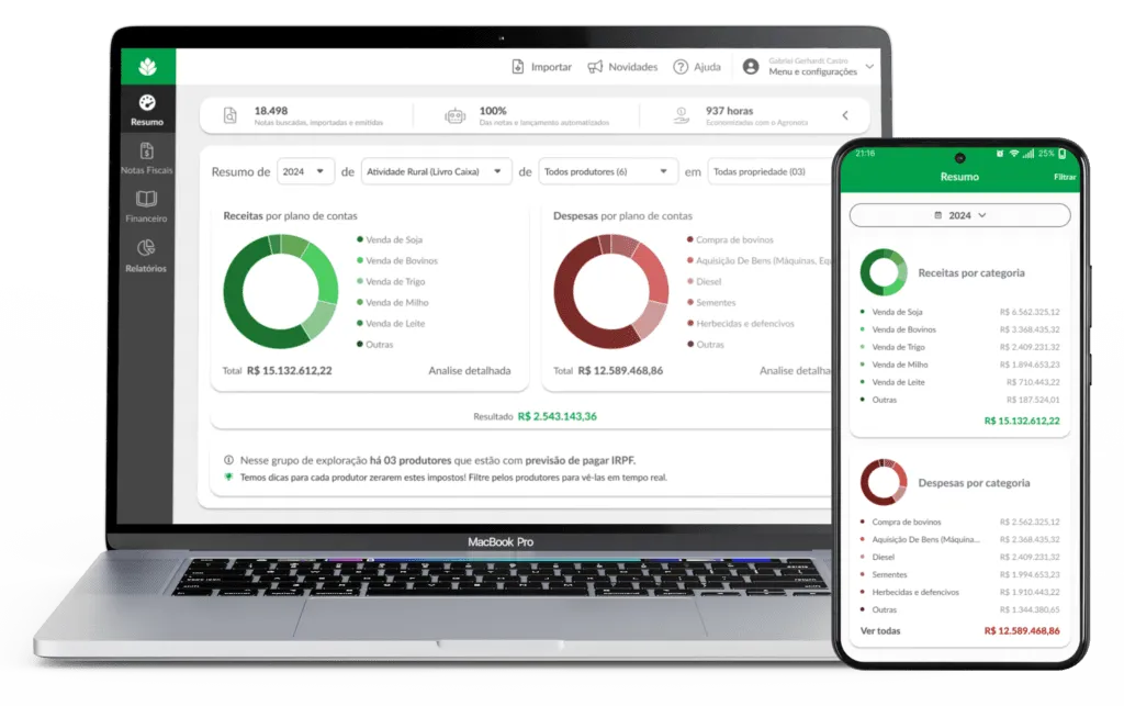 Módulo para produtores rurais que precisam registrar e organizar as movimentações financeiras da atividade rural, facilitando controle diário e consolidação das informações exigidas pela Receita Federal.